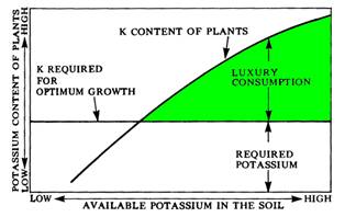 Sometimes, when soil potassium levels are high, plants may take up more potassium than is needed for maximum yield. This “luxury consumption” (see figure) by alfalfa and forage grasses can lead to high levels of potassium in the forage part of the ration. It is important to remember that this luxury consumption is not only influenced by soil potassium levels but also the soil test level of the other cation elements as well as soil moisture and growing conditions.