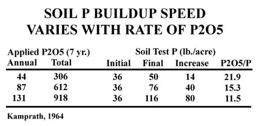 Work by Kamprath in 1964 (Table 2) illustrates that higher rates of application may also affect the efficiency of buildup. While we would expect higher rates of P2O5 to result in a higher soil test, this work also indicates that the higher rates are also more efficient (lower P2O5/P ratio).