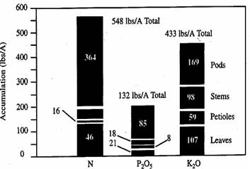 Phosphorus accumulates in the seed and pods while potassium is important to the stems and leaves as well as the pods.